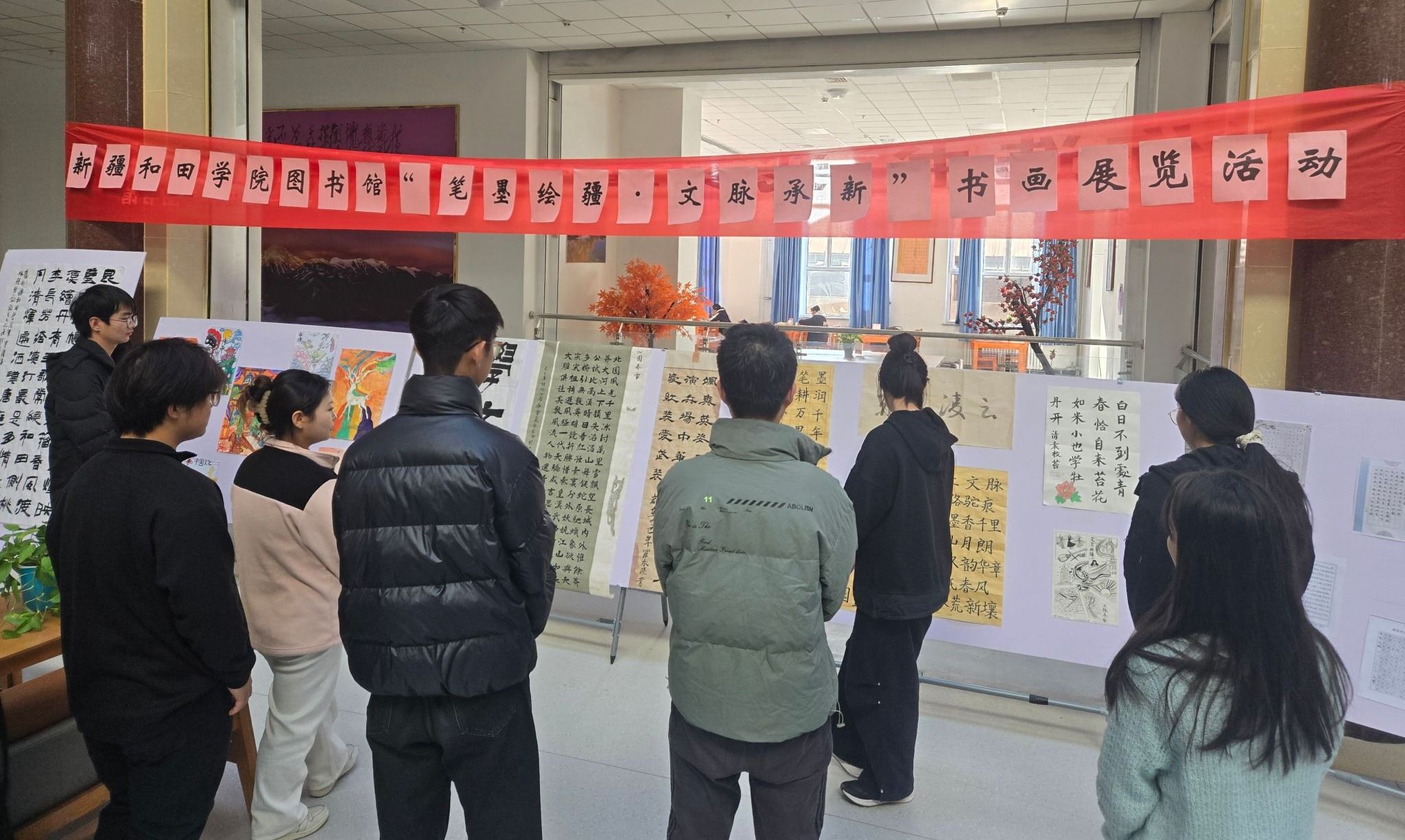 为深化“青春赓续中华文脉行动”,近日,由图书馆开展的“笔墨绘疆·文脉承新”主题书画展系列活动,顺利完成作品征集、评审及展览等关键环节。活动以文化润疆为核心导向,以书画艺术为重要载体搭建文化育人平台,既生动彰显了中华优秀传统文化的独特魅力,也为校园注入了浓厚的文化气息。
